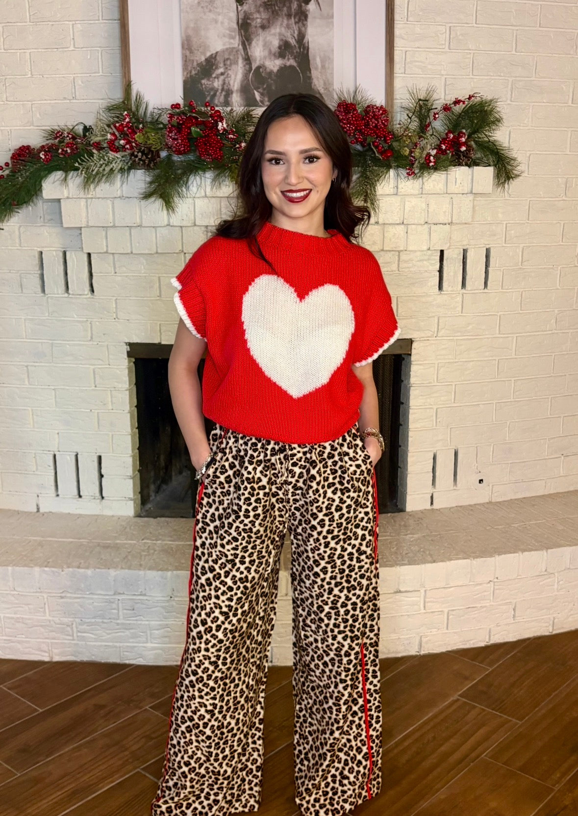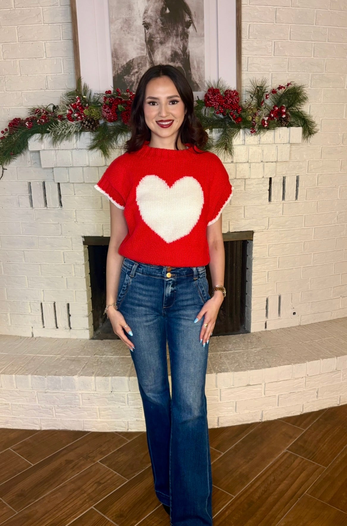 Crafted in a vibrant red knit, features a white heart in the front and white trim at the neckline, sleeves and hem.