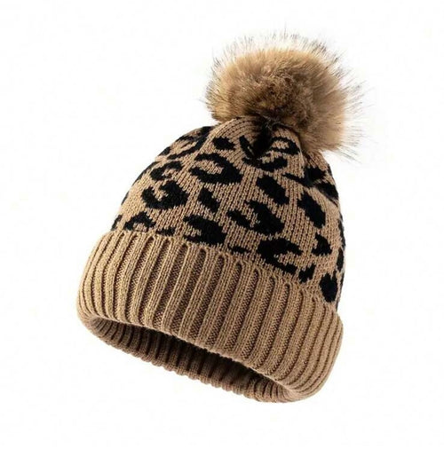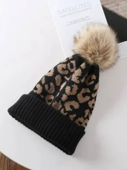 Leopard Knit Pom Pom Beanie (ash mocha)
